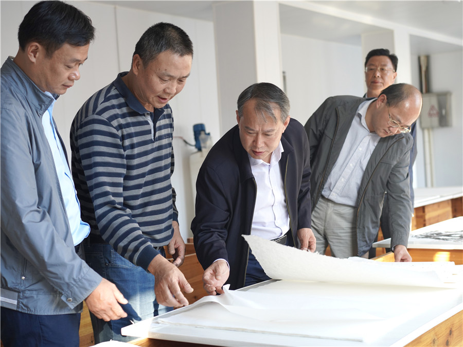 10月9日下午,縣長吳云忠赴海陽鎮(zhèn)凝霜文化發(fā)展公司調(diào)研徽州楮皮紙傳承與發(fā)展工作,縣委常委、海陽鎮(zhèn)黨委書記金學年,縣委常委、縣政府副縣長程衛(wèi)華參加調(diào)研活動。 吳云忠一行實地察看了徽州楮皮紙生產(chǎn)工藝流程,認真聽取企業(yè)負責人介紹,詳細詢問徽州楮皮紙制作工藝